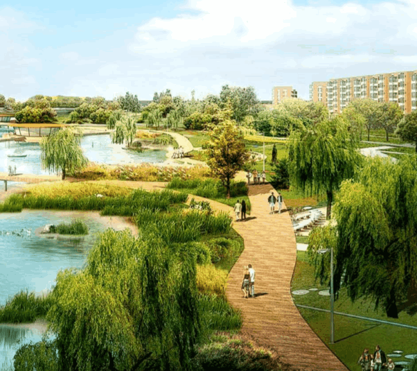 Motorway City offers a clear blue lake, perfect for a variety of outdoor activities like boating, jet skiing, yachting, parasailing, water skiing, and fishing, ensuring residents have access to recreational options in a beautiful setting.